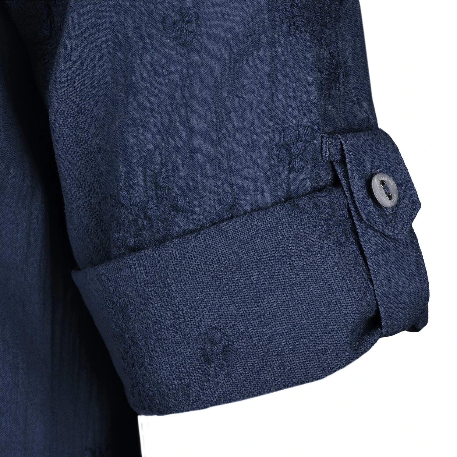 Attraktive, lufitge Bluse mit Dreiviertel-Arm und wunderbar gesticktem Muster, das auch haptisch wirkt, weil es erhaben auf dem Baumwollmaterial verarbeitet ist.